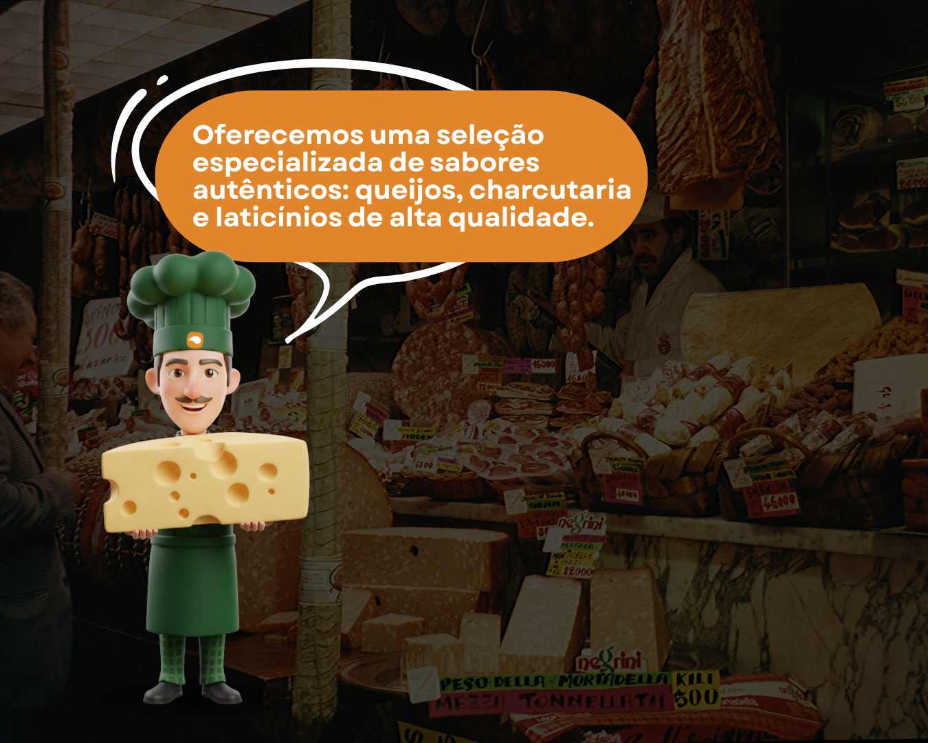 Trabalhamos com uma linha completa de alimentos gourmet, que inclui laticínios selecionados, queijos finos, condimentos, conservas, geleias, natas, requeijões, maioneses, cream cheeses e o melhor da charcutaria artesanal, com produtos como copa, lombo, salames, linguiças, presunto cru e defumados especiais.